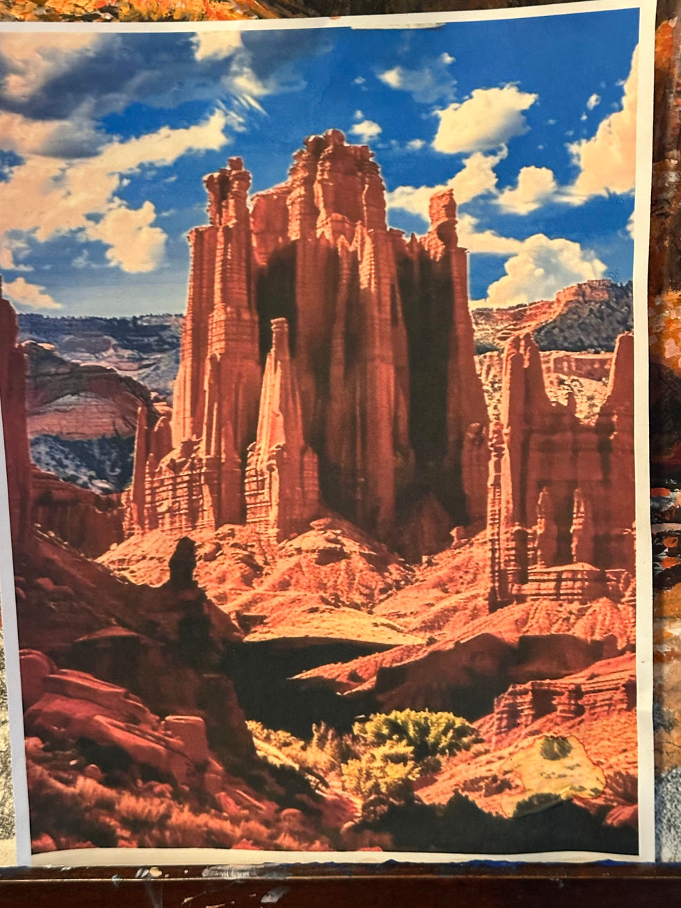 There’s a hush that settles over Cathedral Valley, Utah just before the sun breaks through—when the rock formations feel more like elders than stone. I painted this from a photo taken in Utah, but what moved me most wasn’t the grandeur alone—it was the sense of timeless presence, like these towers had been standing sentinel over the land for ages. Every shadow and crack felt like part of a story too vast to tell in words. I wanted to hold that silence, that weight, in paint.